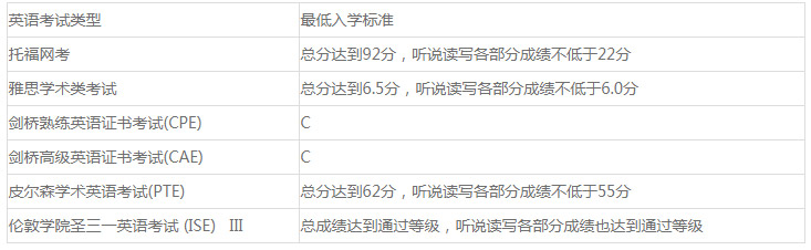 拉夫堡大學(xué)的英語語言能力入學(xué)標(biāo)準:雅思考試總分達到6.5分,并且聽說讀寫各部分的成績不能低于6.0分。個別院系可能有更高的語言要求。下面是拉夫堡大學(xué)認可的語言考試成績以及最低要求。